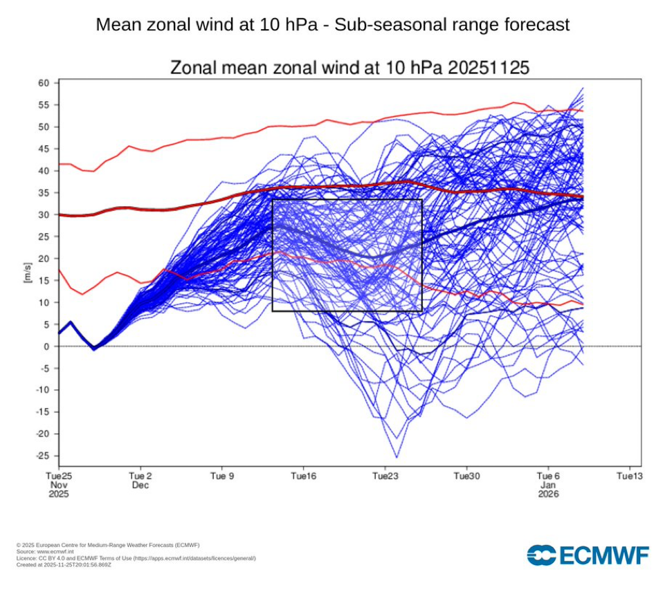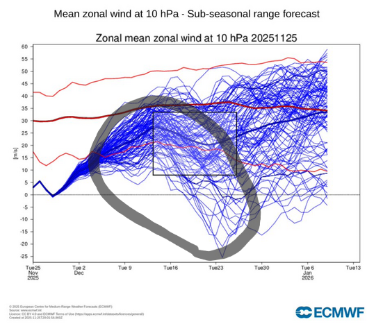 November 26, 2025Nov 26 17 minutes ago, uncle w said: is there a record for these members?...are they numbered and is there an accuracy record for each member?...that goes for other charts too...to many members spoil the forecast... Each of those blue lines are a single ensemble member that measures 10hpa winds around the pole. The weakening will show up as deceleration at 10hpa and end up below the mean There is usually a huge spread among the members But when they cluster they are accurate