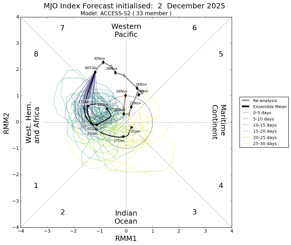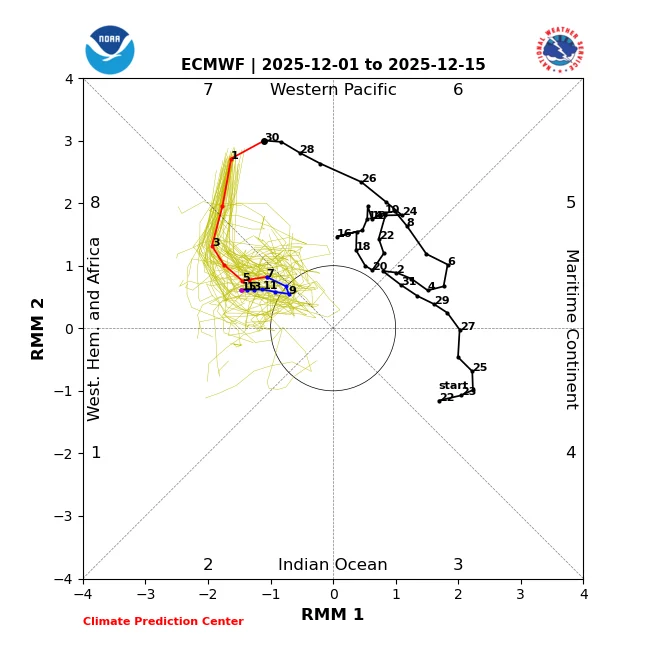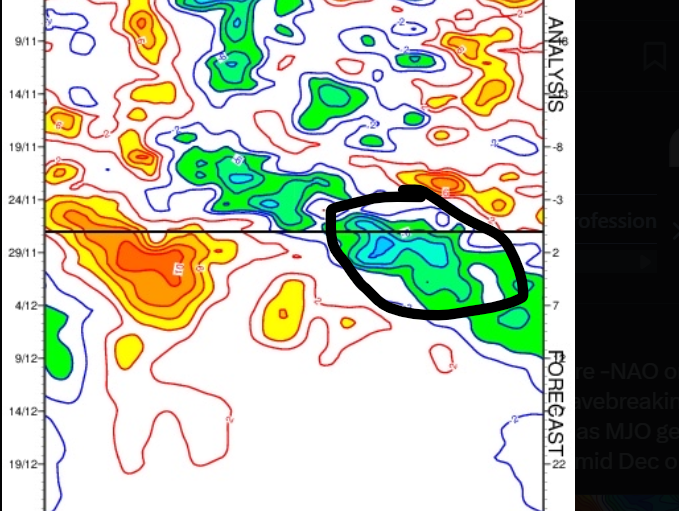 November 28, 2025Nov 28 Black circle is Pjase 8 then 1, pretty strong wave. As Roundy stated it won't be picking ked up correctly on models diagrams of MJO.EQ PAC FOR ENSO regions have warmed nicely so far. Great WWB.