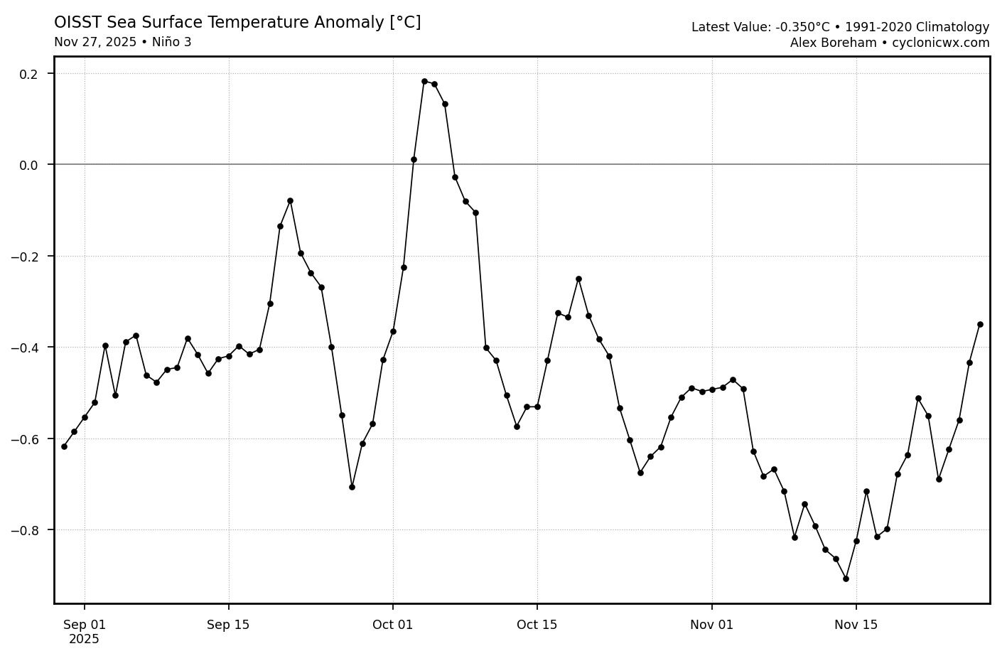 November 29, 2025Nov 29 2 hours ago, amugs said:Black circle is Pjase 8 then 1, pretty strong wave. As Roundy stated it won't be picking ked up correctly on models diagrams of MJO.EQ PAC FOR ENSO regions have warmed nicely so far. Great WWB.La Niña is dying fast.