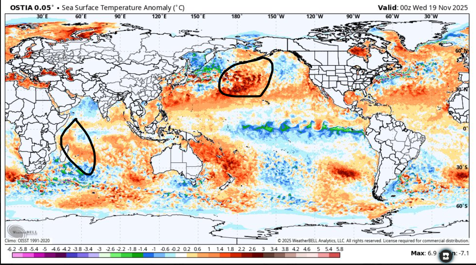 November 20, 2025Nov 20 Notice the warming off the eastern African coast in the IO = Phase 1 and 2 advection for a MJO phase? Notice teh warming in the GOA and the cooling off the Japan Coast and arm blob propgating east - wagons east !! Keep that forarwd motion going and it'll be in the GOA by mid Dec. IF this happens it will strengthen our - WPO /-EPO combo and +PNA. Time will tell. Laslty some cooling west of the Maritime Region 3 and 4. TODAY