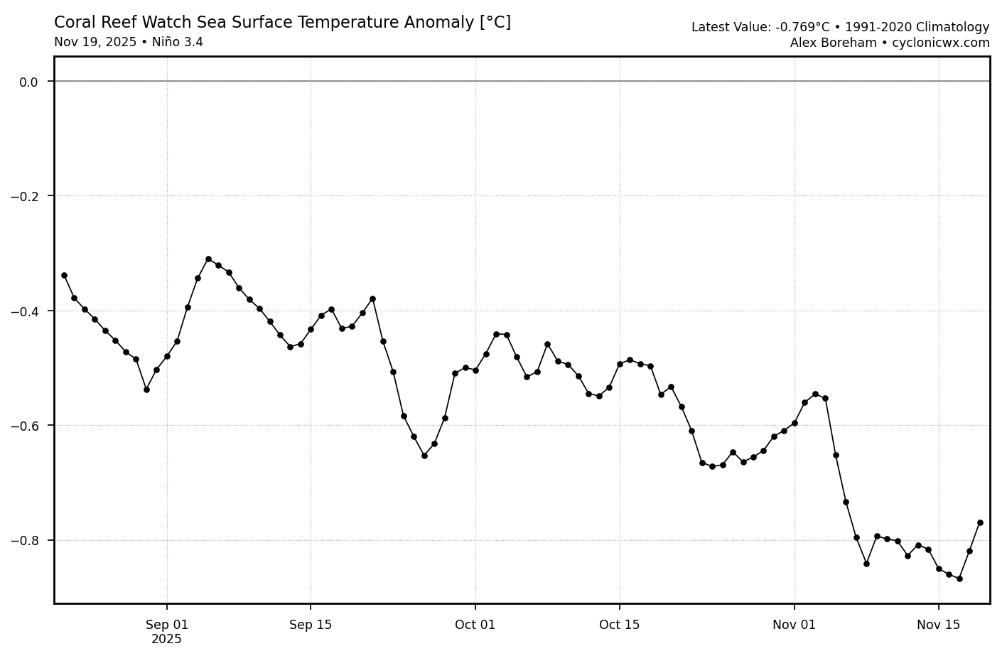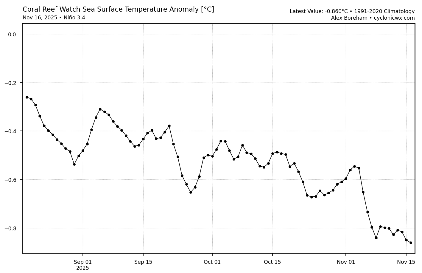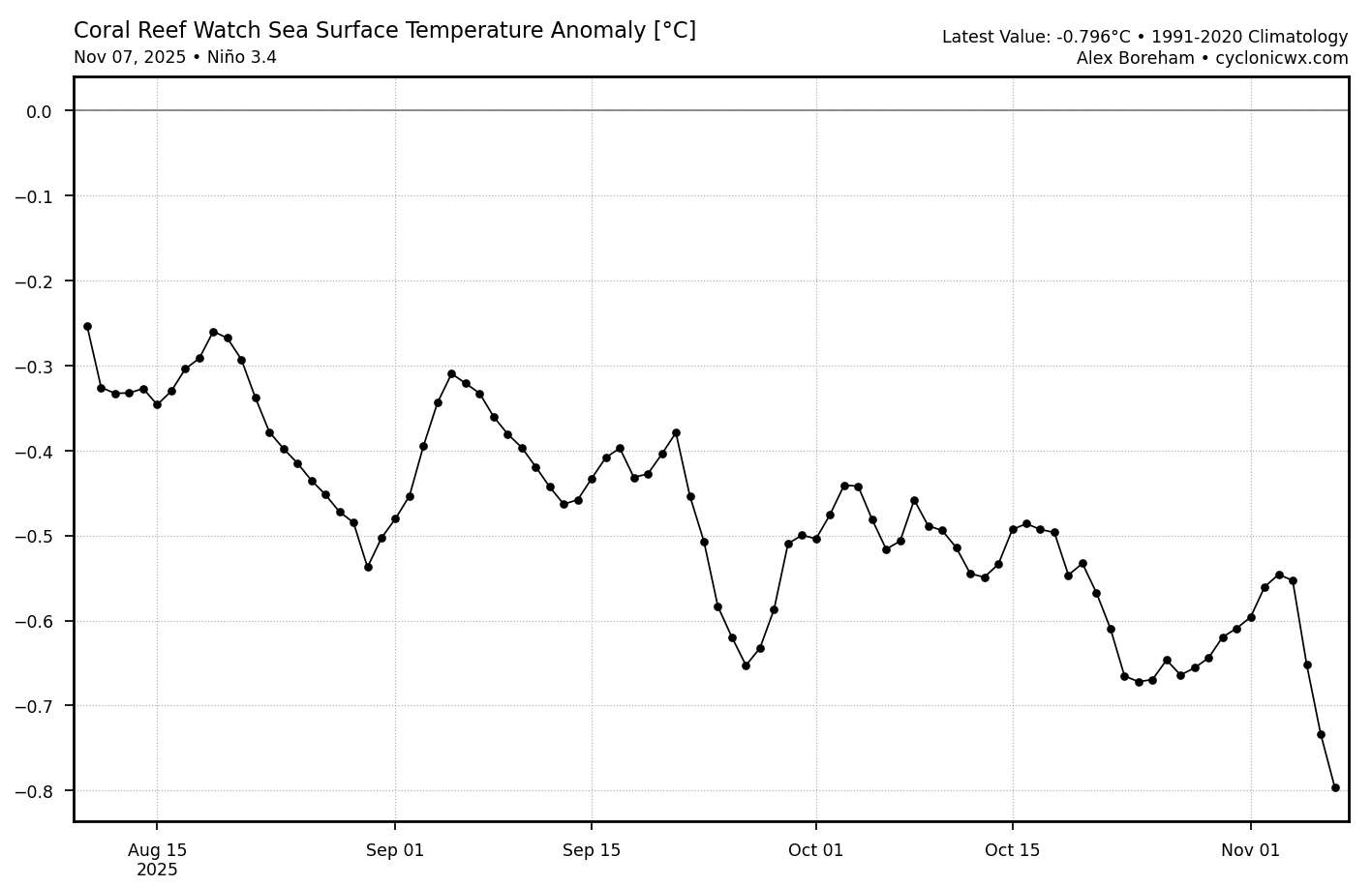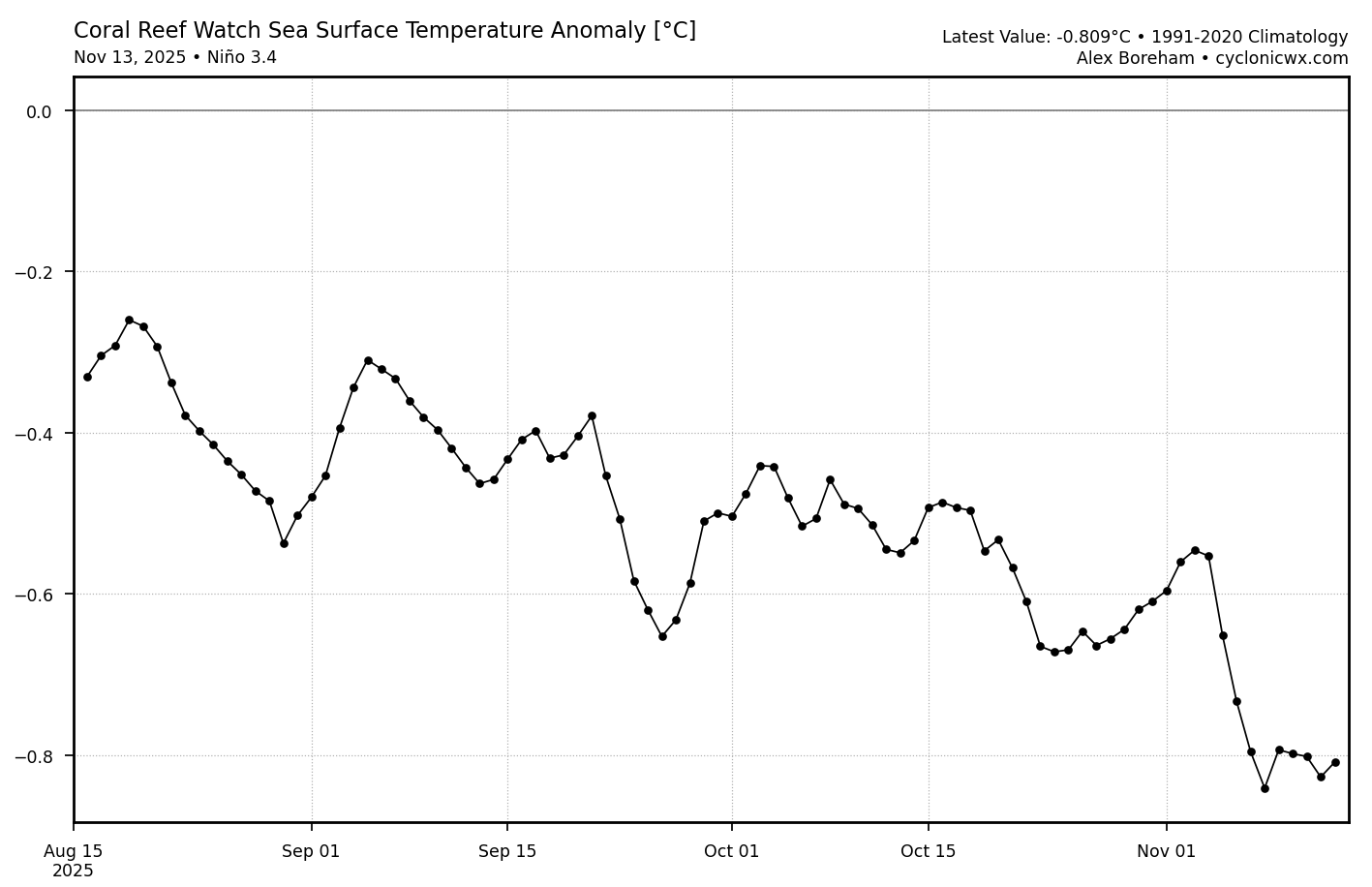 November 10, 2025Nov 10 ASO oni was -0.5...down from -0.3 the month before...last week's oni was at -0.7...we are in a weak la nina now...-0.7 would be nice for the DJF period...forecasts have it from -0.6 to -0.4...-0.4 would be a good number...