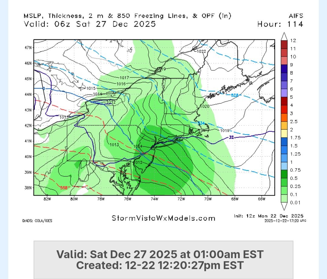 December 22, 2025Dec 22 This was from Mt. Holly's morning discussion - would imagine we see big changes with the afternoon update.Beyond Christmas Day, forecast uncertainty becomes very high. Guidance indicates there will be a high over eastern or southeastern Canada with low pressure moving eastward across the Great Lakes and toward the Northeast or Mid Atlantic. This setup will likely bring precipitation to our area. The 00Z suite of guidance had a significant change in course, indicating a much stronger high and weaker, more suppressed low. This solution would introduce potential for wintry precip for our region and much colder temperatures, quite the change from widespread 50s and rain from before. The shift in guidance was consistent between different models. GFS, ECMWF, and CMC all showing this much colder, wintry solution now, however given this *very* recent change in course, have stuck with NBM for now until there is more consistency in a colder, more wintry solution. Precipitation is still likely, with 50-80% PoPs, however we could be dealing with all rain, a significant wintry system, or anything in between. Remain alert for changes to the forecast for the Friday timeframe.
