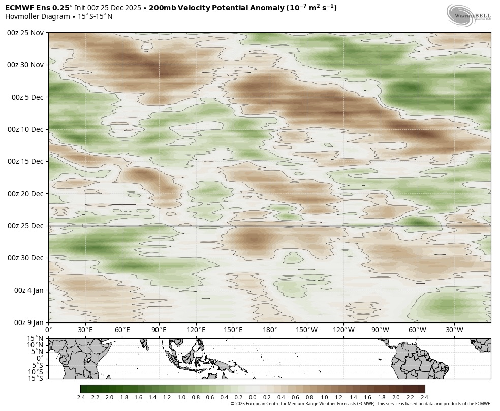 December 25, 2025Dec 25 A reasonable lag between +MT & the downstream effects on the pattern, based on the late-December 2022 event, is close to 7-10 days or so. The timing of this shift on the EPS looks very reasonable, into the 2nd week of January.