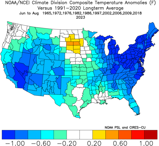 February 15Feb 15 3 hours ago, uncle w said:la nina to el nino year Summers...four summers ended on a cold note when the four years tied the coldest temp on record for August at 50 degrees...Too many years on that list that are from too far back when averages were lower. When you compare that list to the latest 30 year average it will produce a very cold looking map. Can you reproduce this image using 1961-1990 averages?