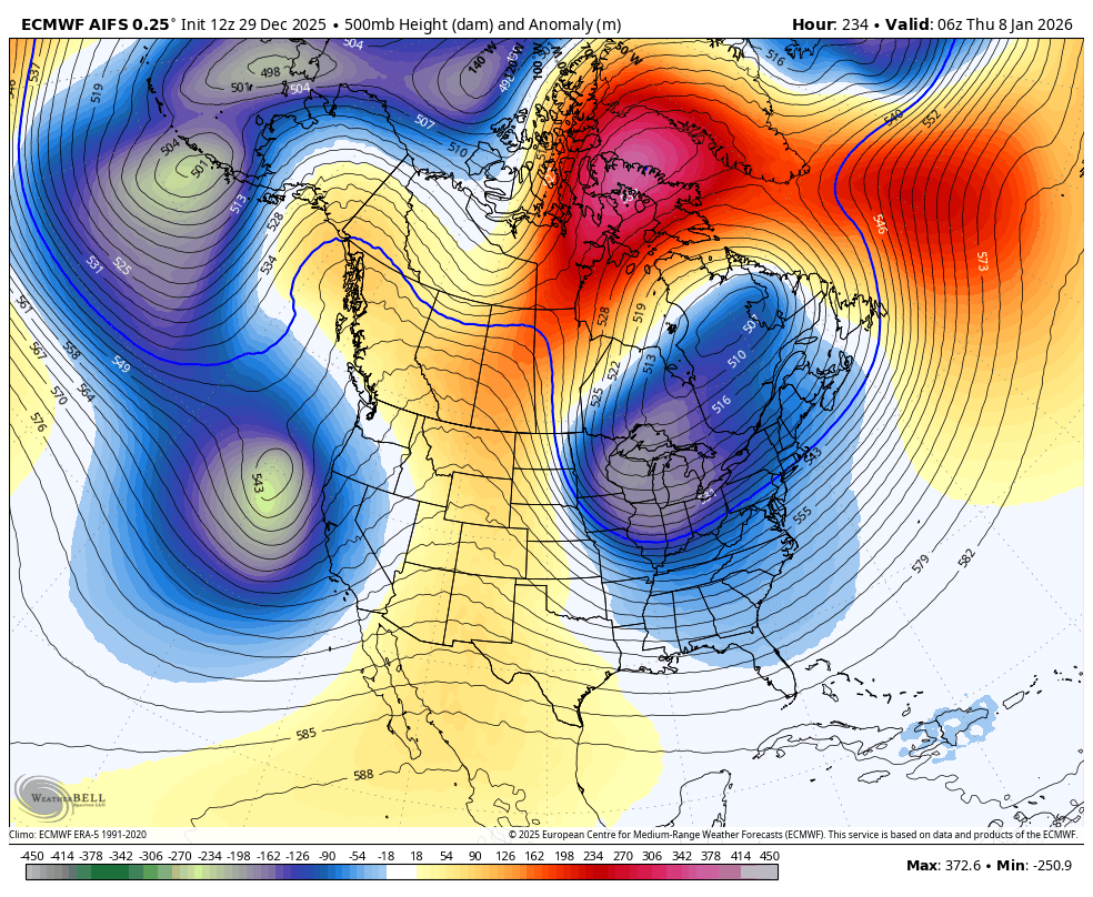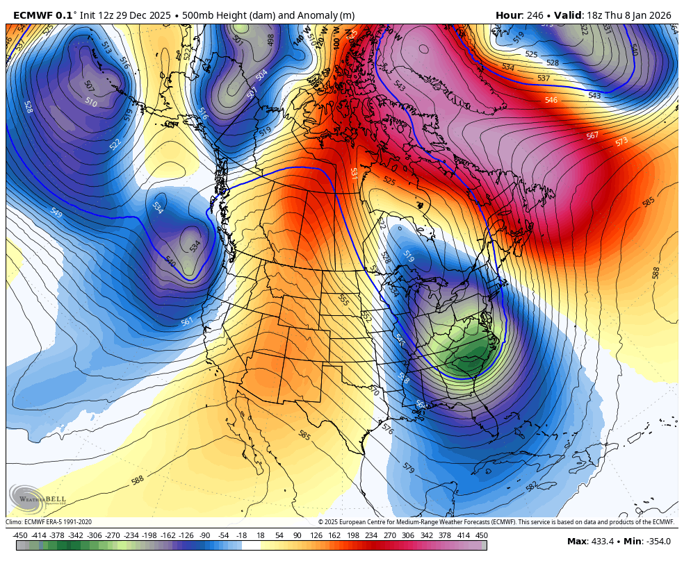 December 29, 2025Dec 29 12Z ECMWF doesn't have a maximum temperature over 36 degrees for the first twelve days of 2026 for Central Park. That has happened three times before: 1940, 1968, 1970. Would have thought that would have happened in the very cold late 1910's.