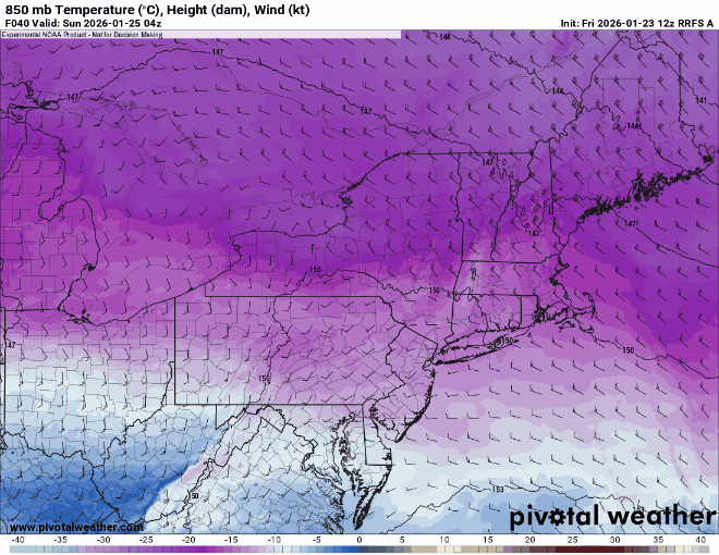 1 hour ago1 hr RRFS at 850.. sustained LLJ without getting flooded by warmth… you’ll notice the places where 850s surge how the winds go due southerly at that level.. there’s a massive 30-40 kt east to southeasterly LLJ that just plows through the tight gradient and the column holds cold and steady enough for NYC metro