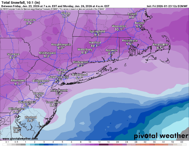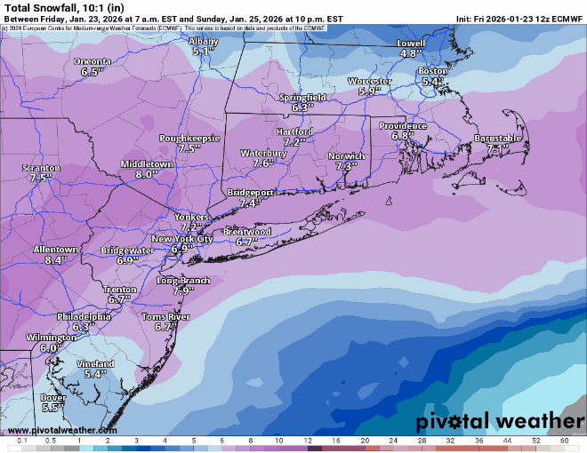 1 hour ago1 hr Little Falls, Londonderry, Windham, Saratoga Lake, Poughkeepsie, Rotterdam, Livingstonville, Mohawk, Hudson Falls, Hancock, New Milford, Saratoga Springs, Hoosick Falls, Hunter, Glens Falls, Amsterdam, New Lebanon, Dover Plains, Bellows Falls, and Catskill 1230 PM EST Fri Jan 23 2026 ...WINTER STORM WARNING IN EFFECT FROM 7 AM SUNDAY TO 7 PM EST MONDAY... * WHAT...Heavy snow expected. Total snow accumulations between 12 and 18 inches. * WHERE...All of eastern New York and western New England. * WHEN...From 7 AM Sunday to 7 PM EST Monday. * IMPACTS...Travel will be very dangerous, especially Sunday night due to snow covered roadways and low visibility. * ADDITIONAL DETAILS...An impactful long-duration winter storm is expected Sunday into Monday. Snowfall rates may exceed one inch per hour at times, especially Sunday afternoon into Sunday night. Light snow will linger through much of the day on Monday. The highest snowfall amounts are expected across the eastern Catskills, Mid Hudson Valley, and southwestern New England.