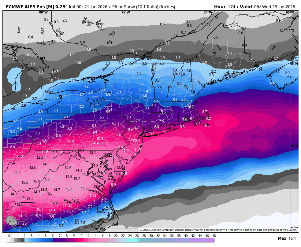 Wednesday at 11:13 AM1 day euro is showing 11 inches i take that an run if there is no sleet mixing in, this is easily 12-18 inches storm i still believe that models will correct themselves somewhat still 3 days tracking.