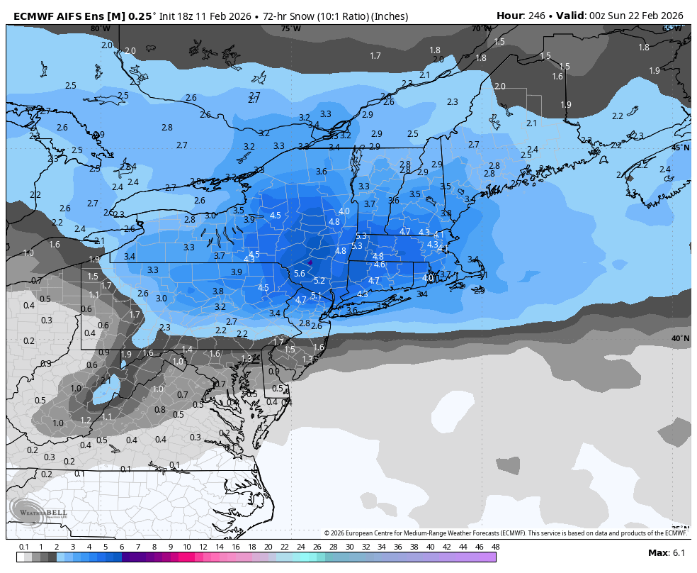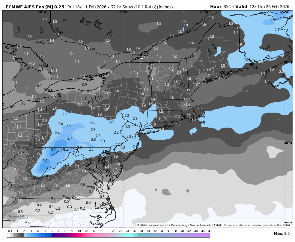 February 12Feb 12 8 minutes ago, jjvesnow said:You got a weatherbell map by any chance?Stormvista snow maps are untrustworthy. The AI EPS have temps of between 35 and 40 degrees throughout the entire area during the storm.