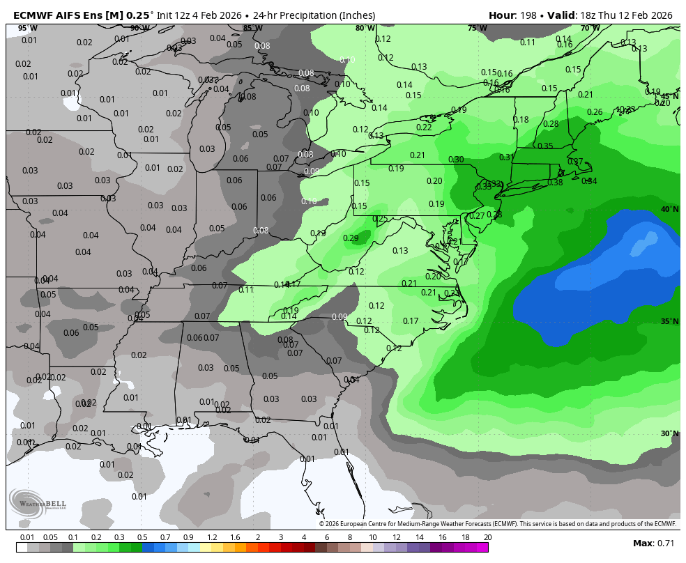 February 4Feb 4 1 hour ago, Keith O said:Looks like more than 1/2 of this is from the event it has on 2/11 so not much with the VDay weekend stormLike the VDay storm potential. Has been showing up for at least a week