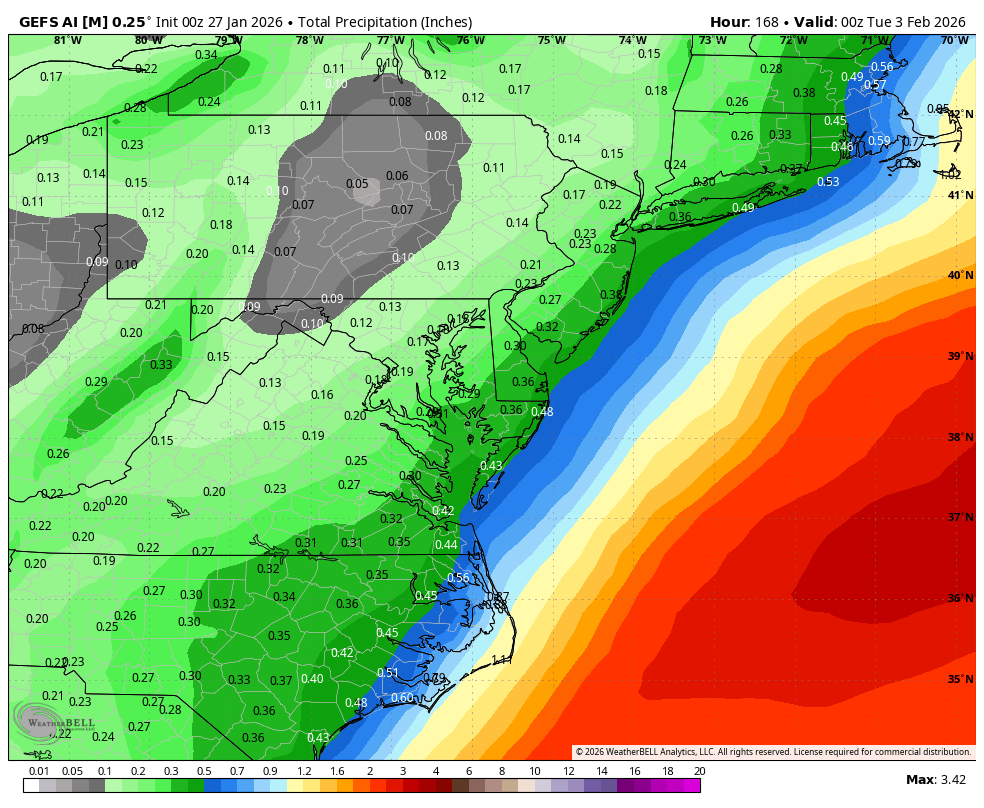 January 27Jan 27 1 minute ago, USAwx said:but to have euro, euro AI, all those ensembles and Deep Mind not see this?no wayNeed to start seeing hits by these in next day or two to be real.