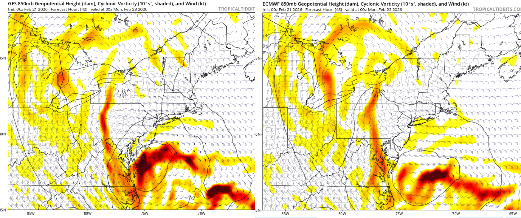 1 hour ago1 hr The differences aloft between the gfs and euro are mostly seen at 700mb-850mb. The GFS has an earlier transfer of the mid-level low's to the delmarva which rapidly develops the SLP, whereas the EURO has maturation of these low's 6-12 hours later than the GFS (Monday morning). Ultimately, it comes down to who is more correct with the evolution and final track of the mid-levels. GFS left vs EURO right valid sunday night. Besides looking at the exact placement of the low, look at the differences in where the vorticity is placed.